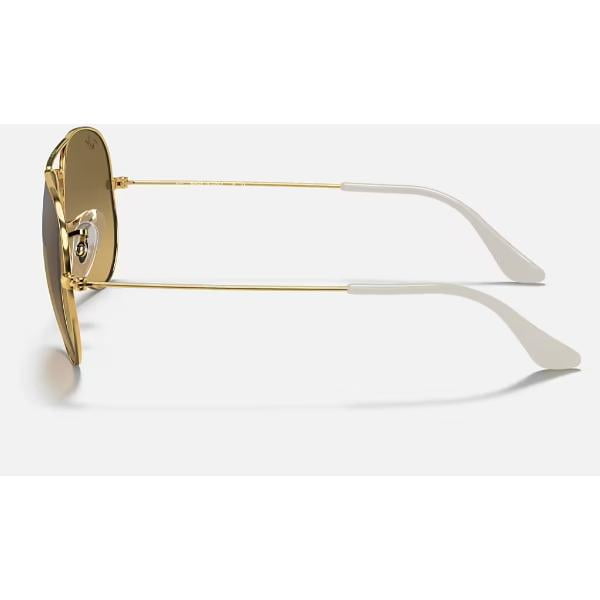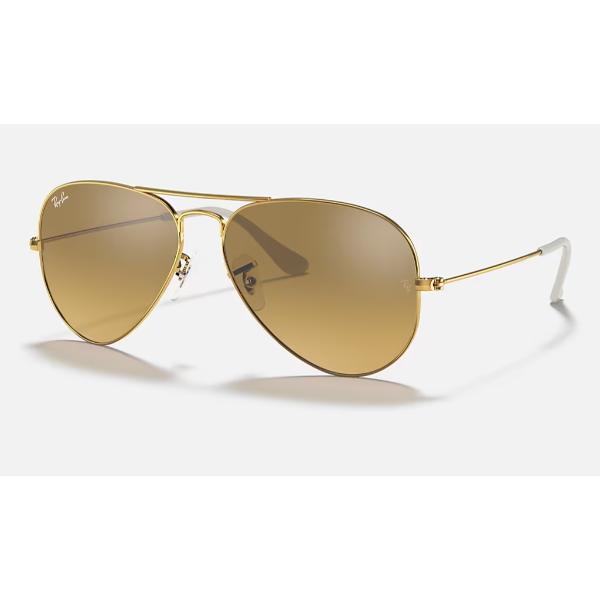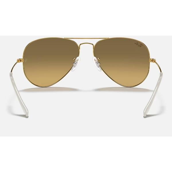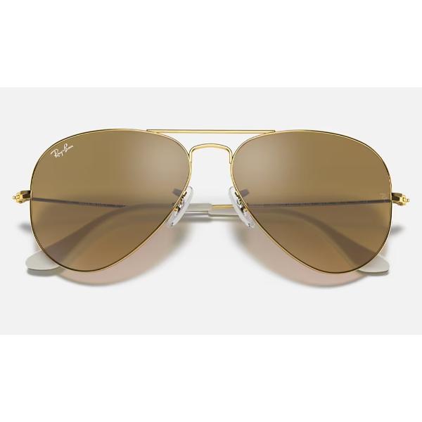 Use gafas de sol con gradiente de aviador RB3025 con montura de bronce y tratamientos de lentes que incluyen gafas de sol polarizadas con cristal degradado en azul, gris con degradado de cristal y degradado en marrón cristal.