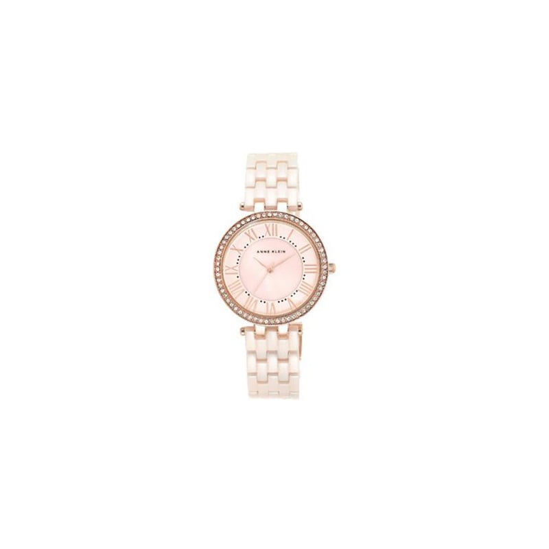 Reloj para mujer de acero inoxidable en tono oro rosa y cerámica. Brazalete de cerámica de color rosa claro. Bisel con incrustaciones de cristales Swarovski. Esfera de color nácar rosa con manecillas en tono oro rosa y marcadores de índice de hora con números romanos. Cristal mineral resistente a rayones. Movimiento de cuarzo. Sin resistencia al agua. Hora, minuto, Segundo.