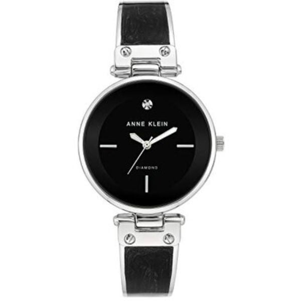 Lente de cristal mineral ligeramente abovedado Esfera negra brillante con diamante genuino a las 12; manecillas y marcadores luminosos en tono plateado Brazalete en tono plateado con relleno de esmalte marmoleado negro; eslabones finales ajustables; broche de joyería y extensor Resistente al agua hasta 100 pies (30 m)