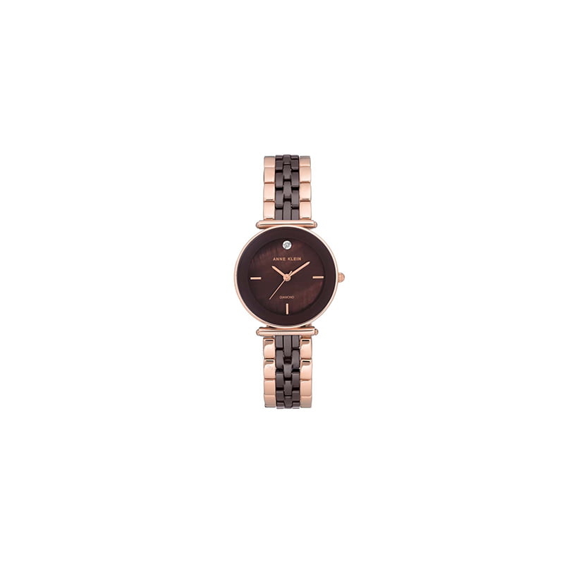 Reloj para mujer de metal en tono oro rosa y marrón. Brazalete de metal en tono oro rosa con eslabones centrales de cerámica ruborizada. Esfera marrón con manecillas en tono oro rosa. Un solo diamante se coloca en la posición de las 12 en punto. Marcadores de índice en las posiciones de las 3, 6 y 9 horas. Cristal mineral resistente a rayones. Movimiento de cuarzo. No resistente al agua. Hora, minuto, Segundo.