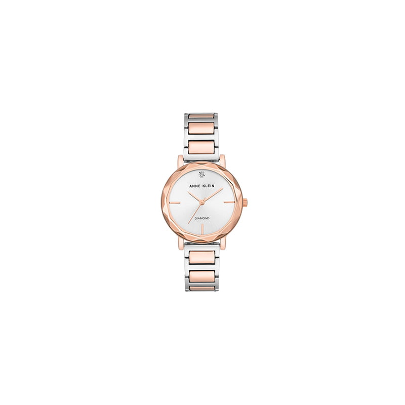 Reloj para mujer de acero inoxidable en tono oro rosa y plateado. Esfera color plateada con agujas en tono oro rosa. Diamante engastado en la posición de las 12 en punto. Marcadores de índice en las posiciones de las 3, 6 y 9 en punto. Cristal mineral resistente a rayones. Movimiento de cuarzo. Resistente al agua. Hora, minuto, Segundo.