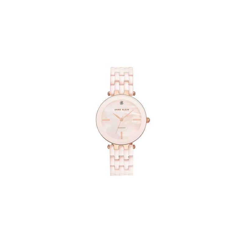 Reloj para mujer de acero inoxidable con brazalete de cerámica rosa pálido con una extensión de latón en tono oro rosa. Bisel fijo de metal en tono oro rosa con anillo de cerámica rosa pálido. Esfera nácar rosa perla con manecillas en tono oro rosa. Un solo diamante se coloca en la posición de las 12 en punto. Cristal mineral resistente a rayones. Movimiento de cuarzo. Resistente al agua.