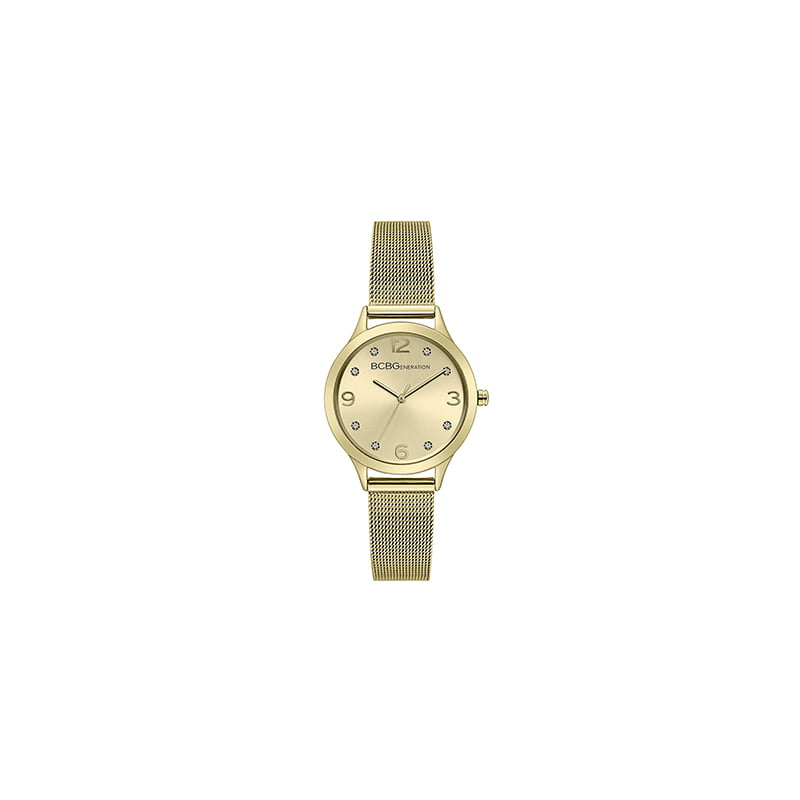 Reloj con banda: oro, material de la banda: acero inoxidable de movimiento cuarzo, tipo de visualización del reloj: analógico, Material de la caja: Metal, Diámetro de la caja: 32 milímetros, Profundidad de resistencia al agua: 30 metros, cierre desplegable con botón pulsador.