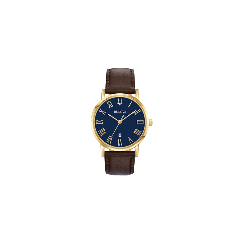 Reloj de hombre de acero inoxidable en tono oro amarillo con correa de piel marrón oscuro. Esfera azul oscuro con agujas en tono oro amarillo y marcadores de hora con números romanos. Movimiento de cuarzo. Cristal mineral resistente a los arañazos. Fecha, hora, minuto, segundo. Resistente al agua.