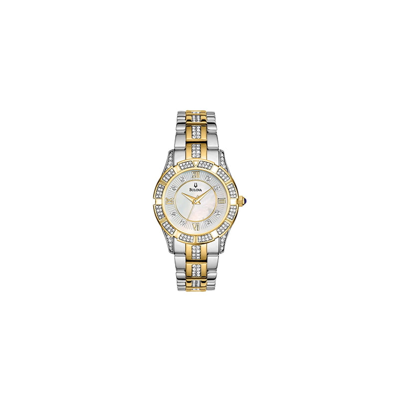 Reloj para mujer de acero inoxidable con brazalete de acero inoxidable en dos tonos plateado y oro amarillo. Bisel con 200 cristales de swarovski engastados individualmente a mano. Esfera de nácar blanco con agujas en tono dorado y marcadores de hora de cristal. Movimiento de cuarzo. Cristal mineral resistente a los arañazos.
