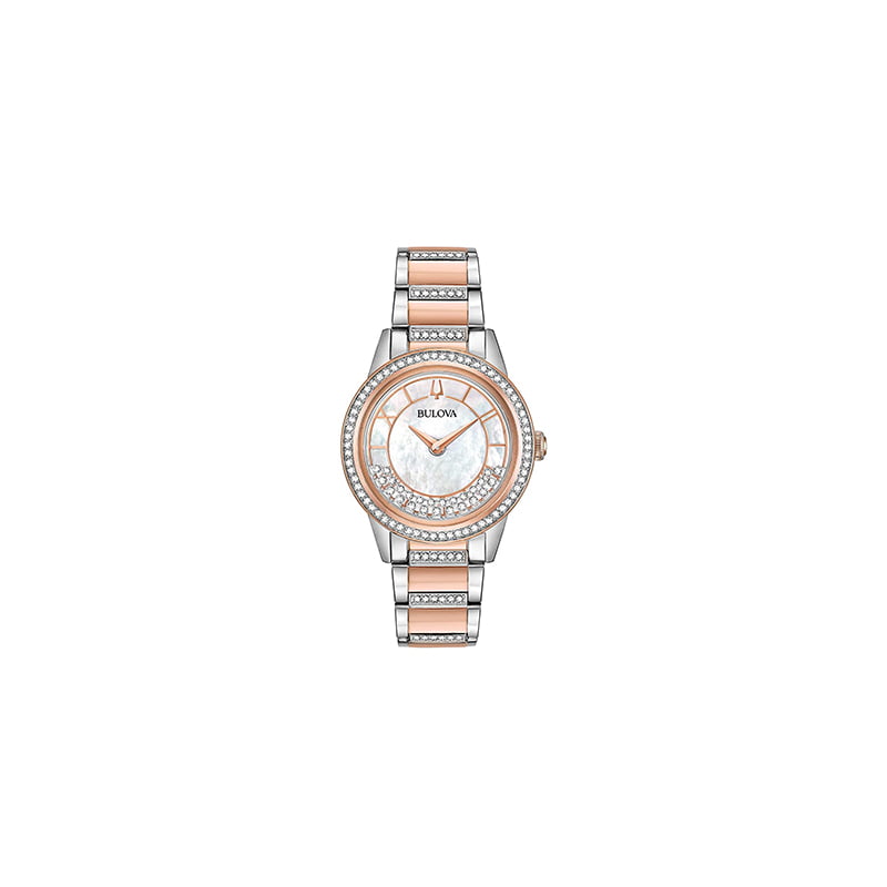 Reloj para mujer de acero inoxidable en tono oro rosa y plateado engastado con cristales. Bisel en tono oro rosa con cristales. Esfera de nácar con agujas en tono oro rosa y números romanos alternados y marcadores de hora índice. Movimiento de cuarzo. Cristal mineral resistente a los arañazos. Resistente al agua.