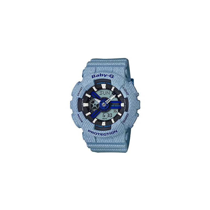 Reloj para mujer de acero inoxidable con brazalete de resina en tono azul claro. Esfera digital con manecillas plateada luminiscentes y marcadores índice de hora. Movimiento de cuarzo. Cristal mineral resistente a los arañazos. Resistente al agua. Fecha, día, hora, minuto, segundo, hora mundial, cronómetro de 1/100 segundos, temporizador de cuenta atrás, 5 alarmas diarias.