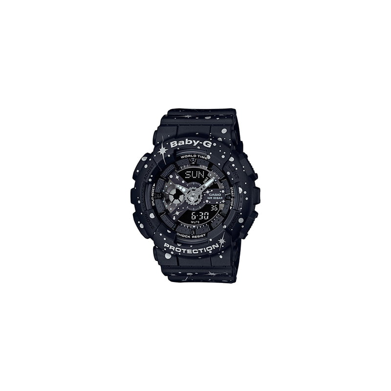 Reloj para mujer de acero inoxidable con brazalete de resina en tono negro. Esfera digital con manecillas plateada luminiscentes y marcadores índice de hora. Movimiento de cuarzo. Cristal mineral resistente a los arañazos. Resistente al agua. Fecha, día, hora, minuto, segundo, hora mundial, cronómetro de 1/100 segundos, temporizador de cuenta atrás, 5 alarmas diarias.