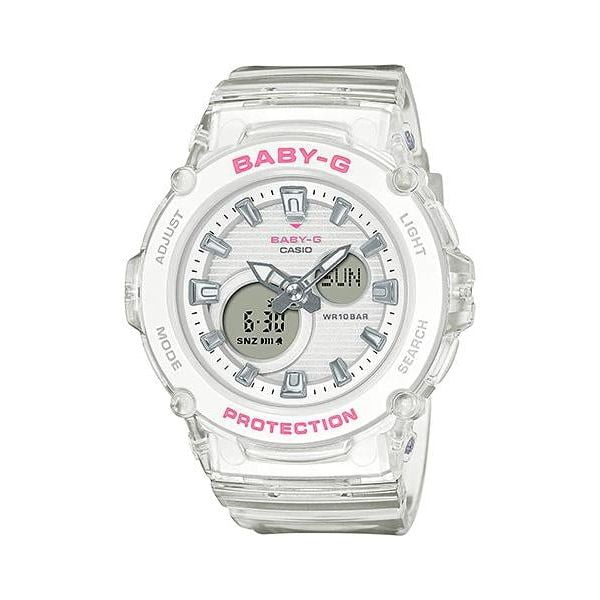 Una «Serie Color Skeleton» perfecta para el aire libre. En la base se seleccionó un BGA-270, que presenta una estructura de bisel que integra diferentes partes en la parte superior e inferior. Se utiliza una resina blanca translúcida casi pura en la correa y la caja, y la caja tiene un acabado en un diseño de esqueleto transparente.