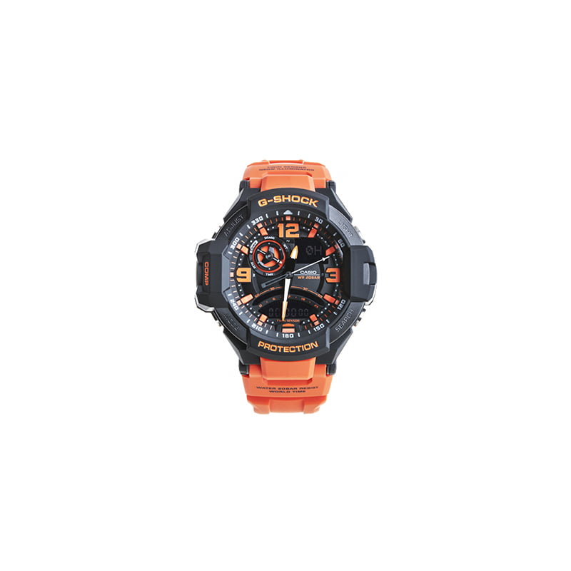 Reloj para hombre de acero inoxidable y de resina en color naranja y negro. Esfera negra con agujas luminosas y marcadores de hora en números arábigos en las 12, 3 y 9 en punto. Marcadores de índice de hora. Movimiento de cuarzo. Cristal mineral resistente a los arañazos. Fecha, día, hora, minuto, segundo, luz led, cronómetro, señal horaria, temporizador, alarma diaria, formato de 12/24 horas.