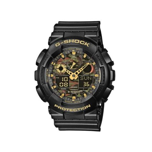 De la popular serie GA-100, grande y osada, viene una nueva colección de modelos que cuenta con una esfera con diseño de camuflaje. Los colores básicos negro o gris contrastan con el diseño de camuflaje metálico, el que tiene detalles de color plata u oro en las agujas y el marcador de hora.