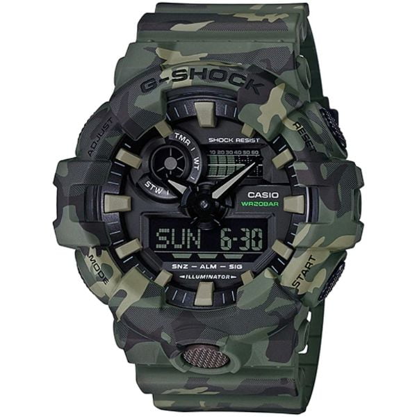 G-SHOCK es la marca de relojes que siempre encuentra formas de incorporar íconos de la cultura mundial en diseños nuevos y emocionantes, y estos nuevos modelos están inspirados en los patrones de camuflaje que son una parte muy importante de la moda actual. El modelo base es el GA-700, cuya característica principal es su icónico botón frontal. La correa está decorada con un patrón de camuflaje auténtico, y las superficies de las cajas y correas están impresas con una tecnología que permite mostrar más superficies impresas de lo normal, lo que permite un total de cuatro colores, además del color base de resina. Los modelos de esta línea vienen en uno de los tres colores estándar: azul marino, caqui y gris. Los patrones de camuflaje realistas agregan un toque tenue al GA-700 para un diseño verdaderamente moderno. • Cronómetro con alarma de tiempo objetivo • Función de cambio de manecillas • Super Illuminator