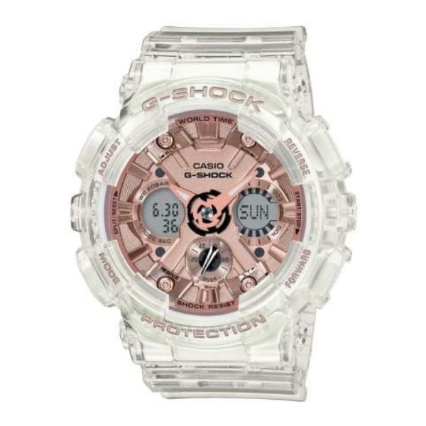 Un modelo basado en una versión de tamaño medio del popular modelo GA-120 combinado digital-analógico. La banda translúcida acentuada por una esfera de oro rosa para crear un modelo casual, deportivo y unisex. Un moderno G-SHOCK más pequeño, perfecto para la cultura juvenil.