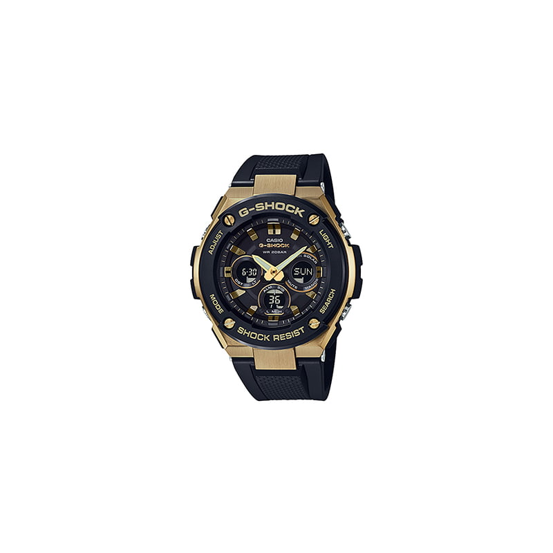 Reloj para hombre de acero inoxidable y de resina en color negro y oro amarillo. Esfera negra digital analógica con agujas luminosas marcadores de índice de hora. Movimiento de cuarzo. Cristal mineral resistente a los arañazos. Fecha, día, hora, minuto, segundo, luz led, cronómetro, señal horaria, temporizador, alarma diaria, formato de 12/24 horas.
