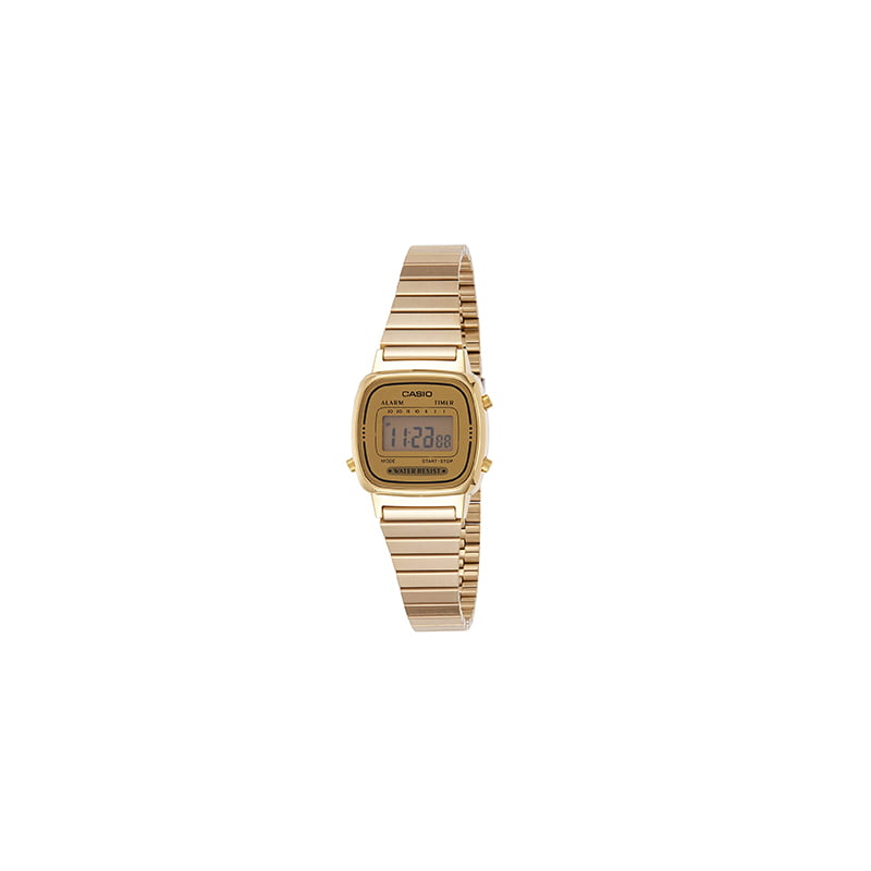 Reloj para mujer de acero inoxidable en color dorado. Caja dorada digital, Movimiento de cuarzo. Cristal mineral resistente a los arañazos. Hora, minuto, segundo, luz led, cronómetro, temporizador, alarmas diarias, formato de 12/24 horas.