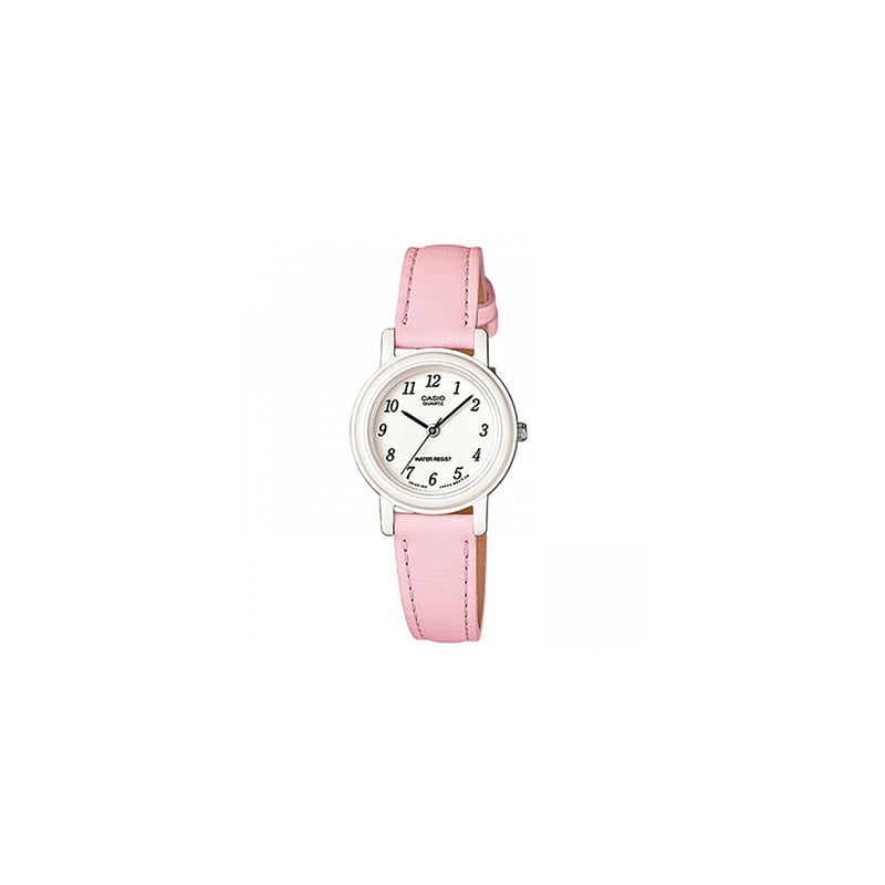 Reloj para mujer de acero inoxidable y resina. Correa de cuero color rosa claro. Esfera color blanco con manecillas en tono negro y marcadores de números arábigos de hora. Movimiento de cuarzo. Cristal mineral resistente a los arañazos. Resistente al agua. Hora, minuto, segundo.